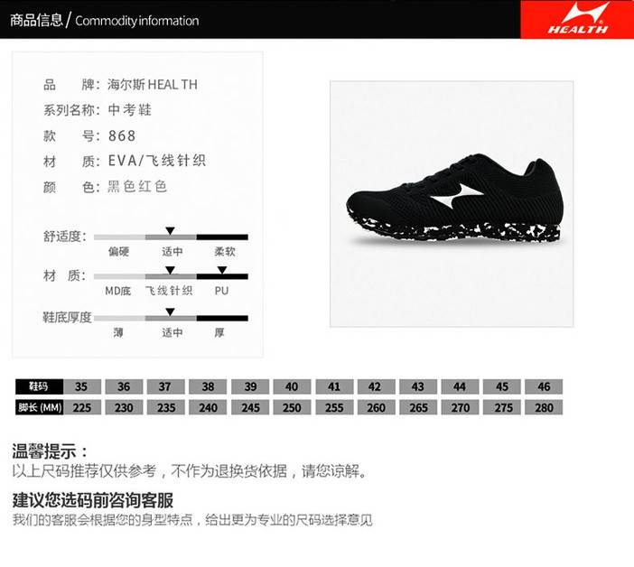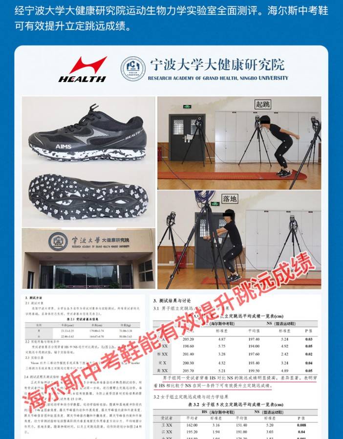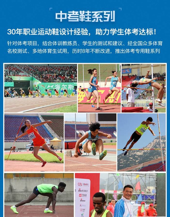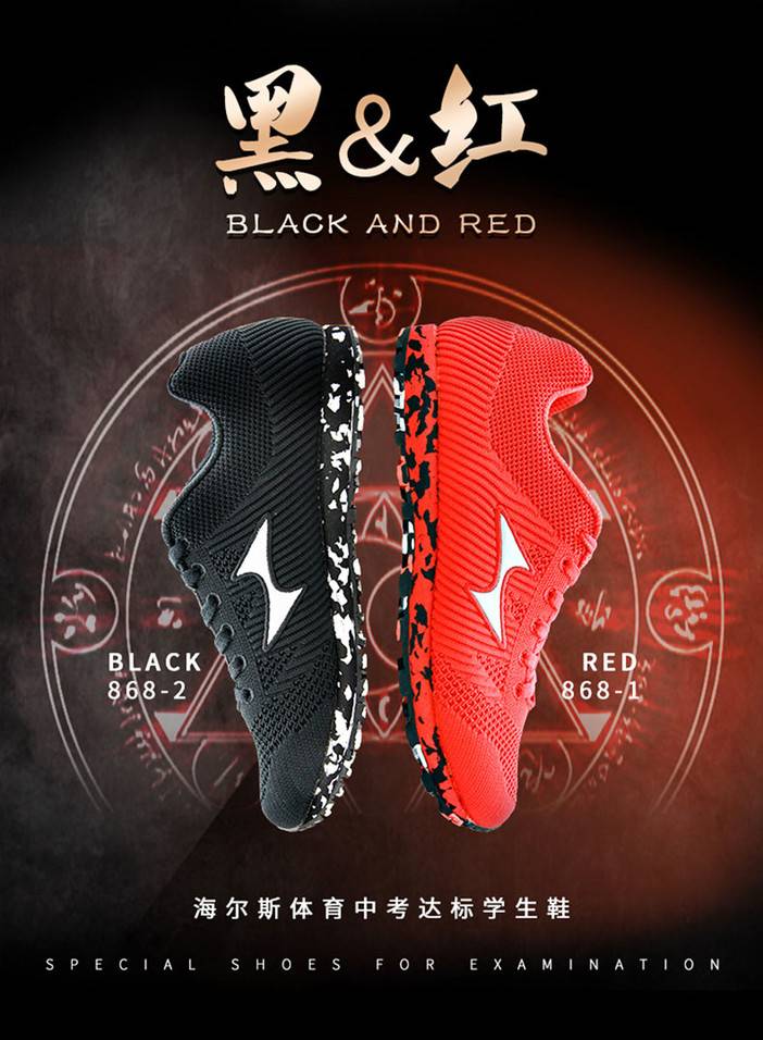 为提高学生中考体育成绩,海尔斯针对中考体测项目得分要点,运用自身30年制鞋经验,结合海尔斯力学实验室和教练员考生的测试数据和建议,经全国各大体育名校测试、多地专业队试用,历时八年不断改良,研发出中考体育考试专用鞋系列,简称中考鞋(868和699S)。