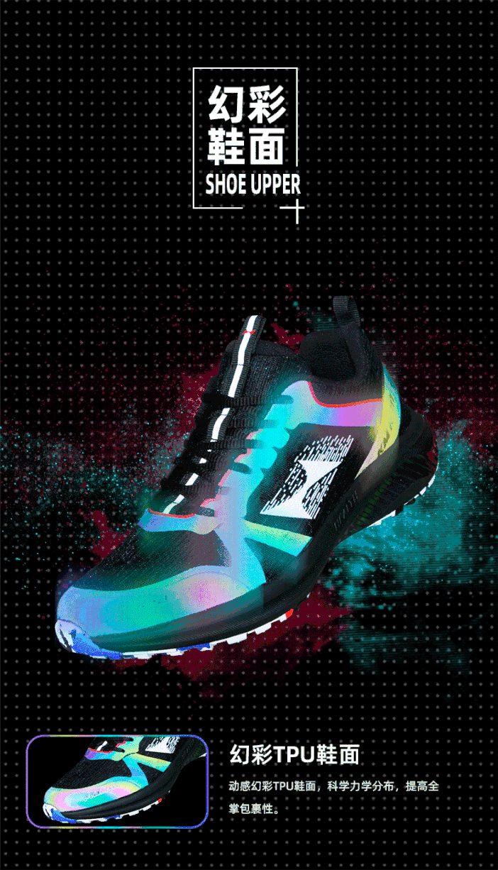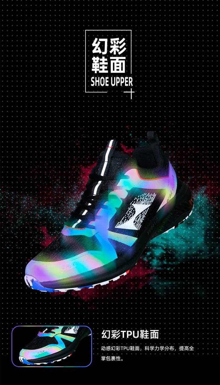 幻彩TPU鞋面:动感幻彩TPU鞋面,科学力学分布,提高全掌包裹性。