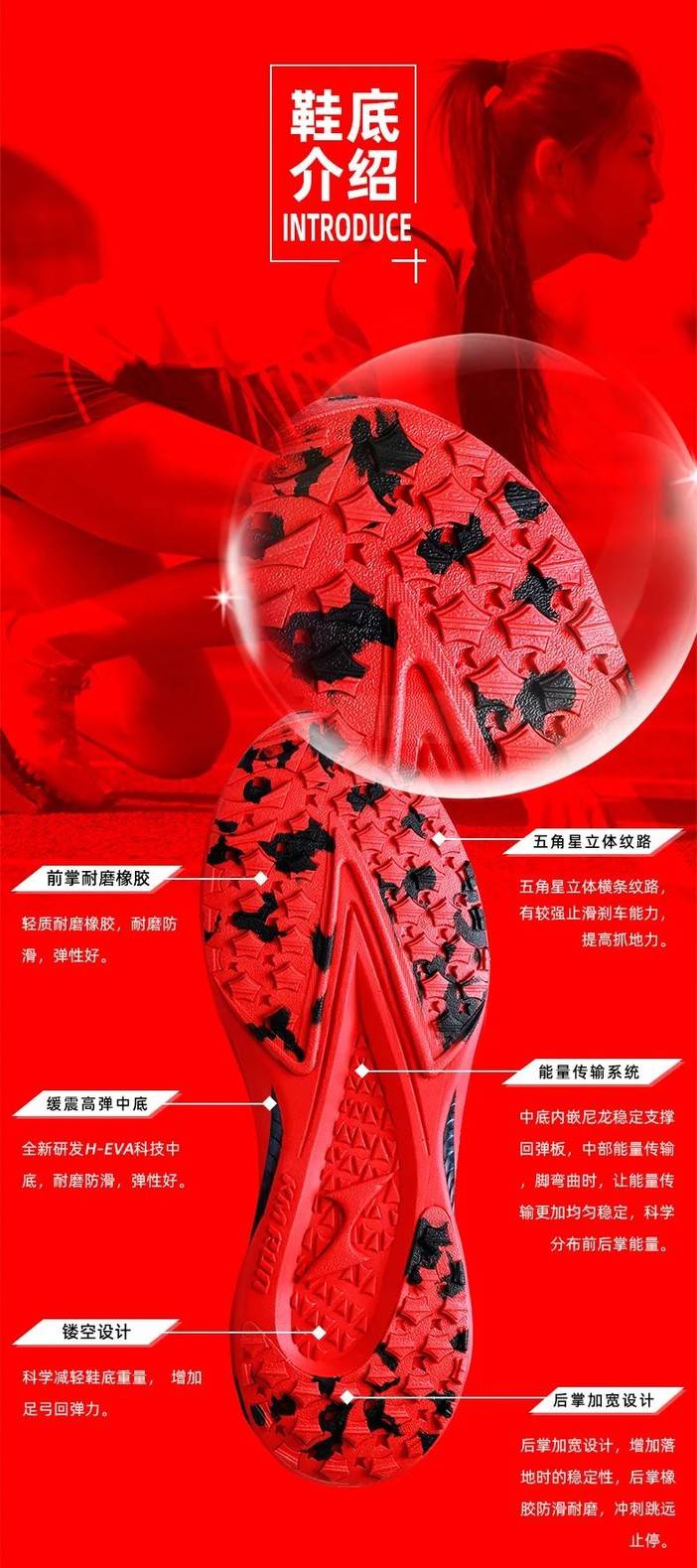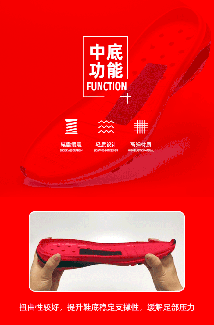 鞋底:前掌耐磨橡胶、五角星立体纹路、缓震高弹中底、能量传输系统、镂空设计、后掌加宽设计。